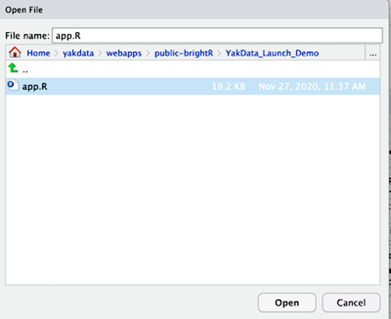 For simplicity, let’s focus on opening and reviewing an R shiny app that’s already published to ConnectR. The R file for this app is located in the YakData Launch Demo file, titled “app.R”.