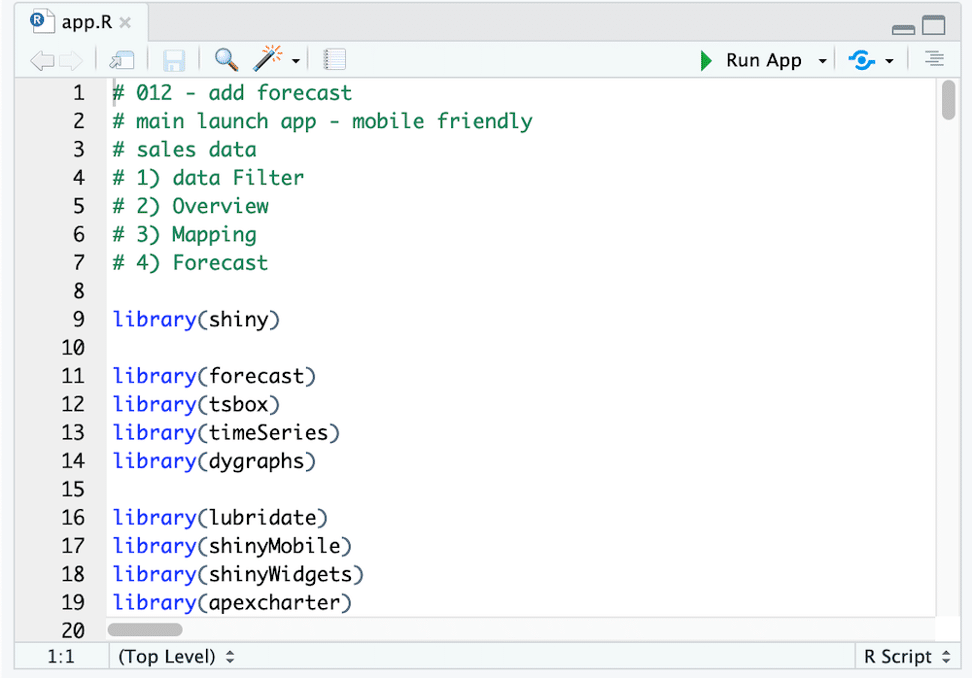 Opening the app.R file lets you see how this R shiny app is built. In this example, the R code window displays important comments at the top followed by many R library statements. As you scroll down, you’ll see hundreds of lines of R code which powers the app.