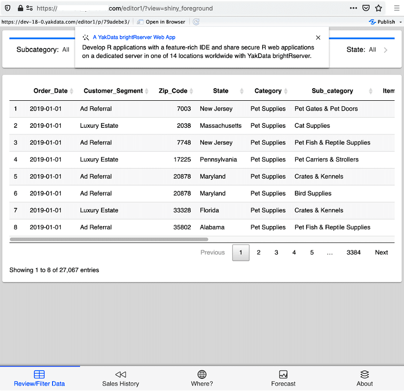 The screenshot shows how clean and simple the final R shiny app can appear. Even users who are not technically skilled can easily sort and filter the data and page through the various tabs at the bottom of the screen. View and interact with the YakData ConnectR mobile-friendly forecaster app live in the gallery.
