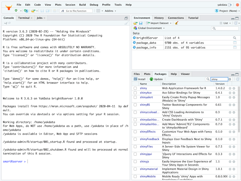 Building, maintaining, and improving interactive R shiny apps has never been easier. YakData’s ConnectR seamlessly combines the best-in-class R editor and R web app server with Secure FTP publishing and synchronization.